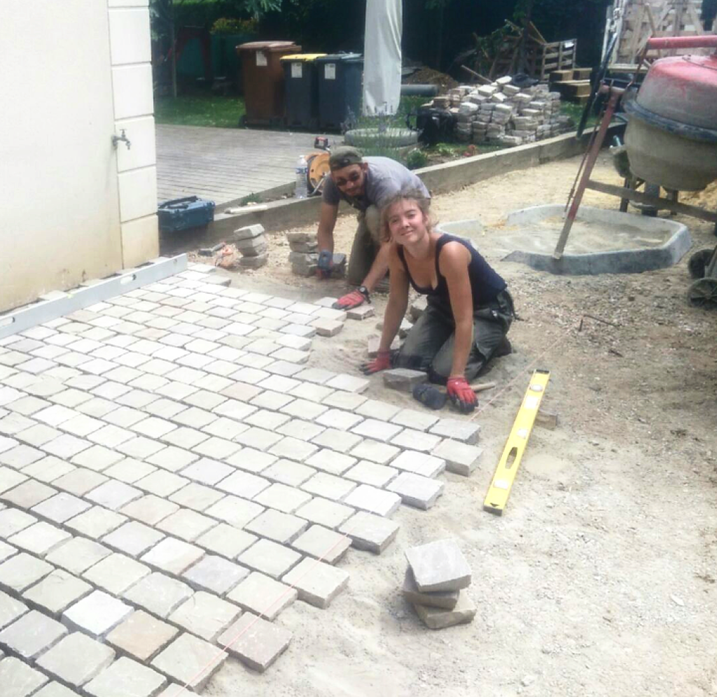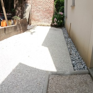 Mise en œuvre d’une allée carrossable en dalles alvéolées gravillonnées avec parvis en pavés de grés ocre nuancé.