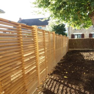 Consolidation d’un grillage existant avec mise en place d’une brande de bruyère. Implantation de panneaux persiennes en Pin.
